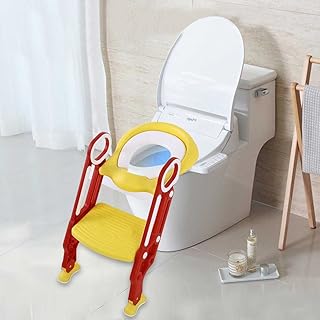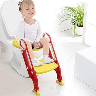 GOTOTO Toilettensitz für Kinder mit klappbarer Leiter, Toilettensitz für Kinder, Toilettensitz, Toilettensitz, Toilettensitz, rutschfest, höhenverstellbar (rot + gelb)