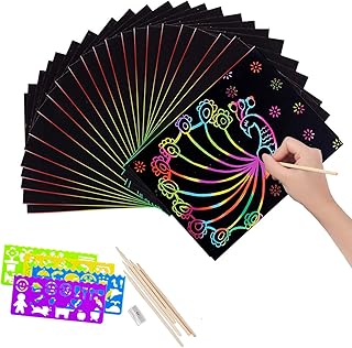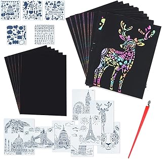 50 Blatt Scratch Art Papier Set für Kinder, DesignerBox Scratch Off Paper Black Magic Rainbow Malbretter mit 5 Holzstiften und 4 Zeichnungen Schablonen Lineal und 1 Bleistiftspitzer.